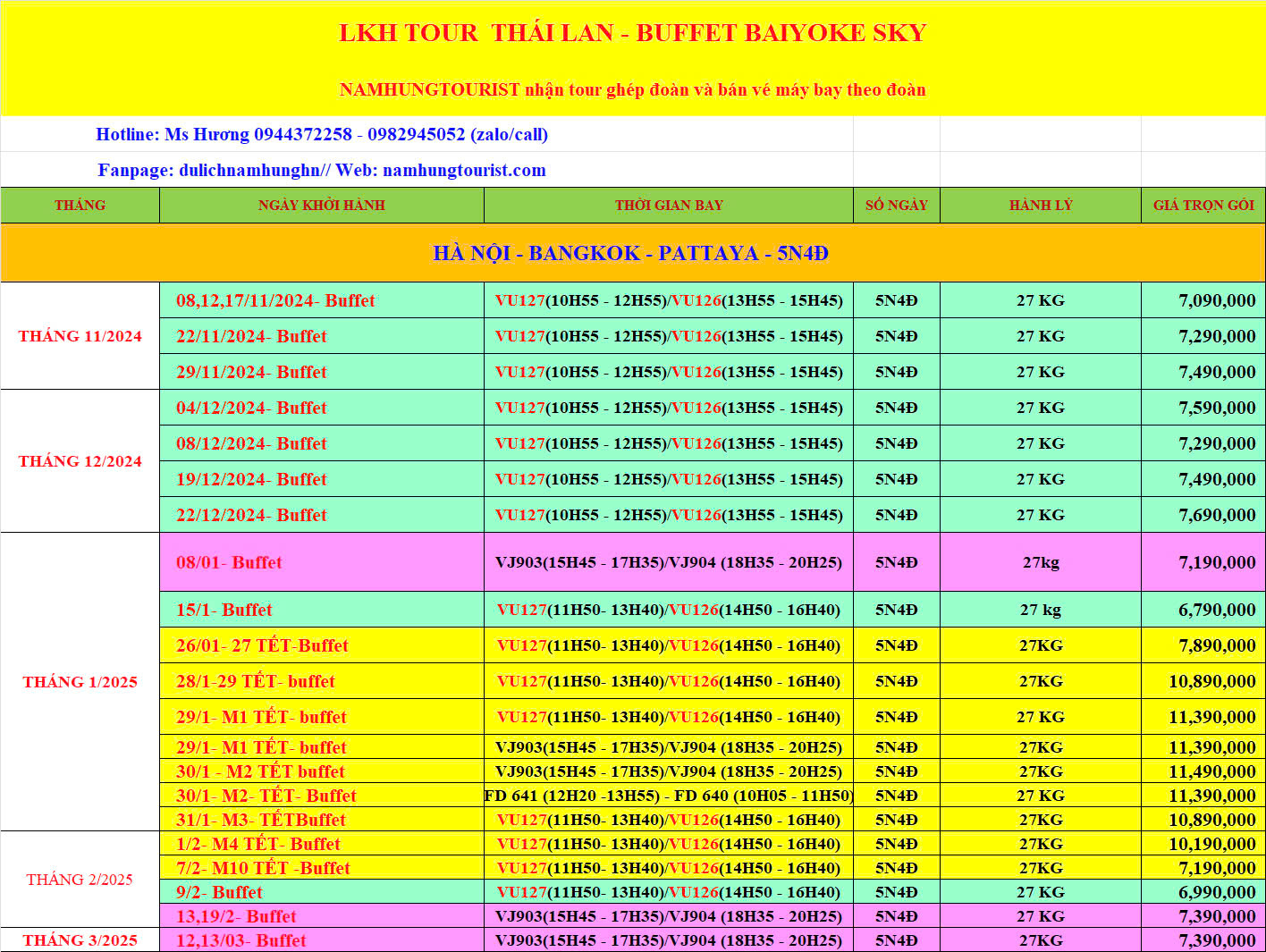 HÀ NỘI - BANGKOK - PATTAYA - BUFFET BAIYORKE SKY- HÀ NỘI